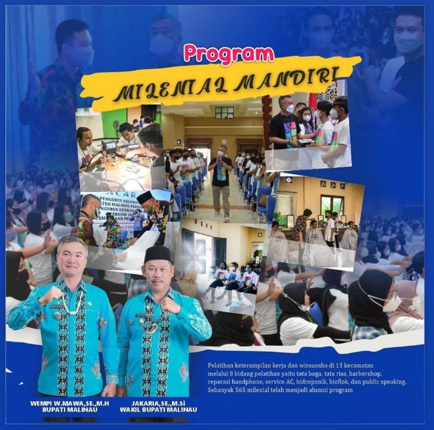 Milenial Mandiri yang merupakan program terobosan untuk memberdayakan kaum milenial melalui pelatihan-pelatihan dalam rangka membangun kapasitas dan keterampilan masyarakat serta pembentukan organisasi milenial yang berbadan hukum.
